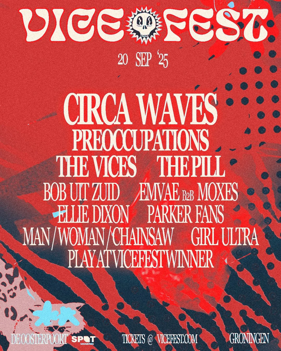 GRONINGEN20/09/25 line-upcirca waves (uk)the vices (nl)PREOCCUPATIONS (can)ELLIE DIXON (uk) man/woman/chainsaw (uk)bob uit zuid (nl)girl ultra (mex)emvae B2B MOXES (nl) PARKER FANS (nl)the pill (uk) TICKETS